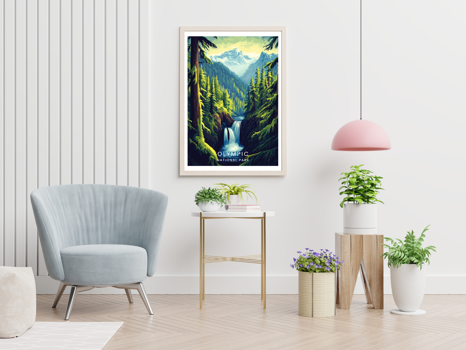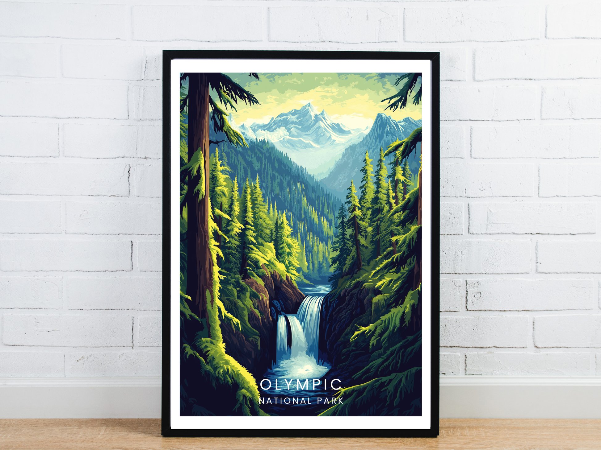 Immerse yourself in the untamed landscapes of the Pacific Northwest with this Olympic National Park travel poster by Atlas Prints. Inspired by classic mid-century tourism art, it captures the park’s towering evergreens, misty mountains, and rugged coastline — a tribute to one of America’s most diverse national parks.