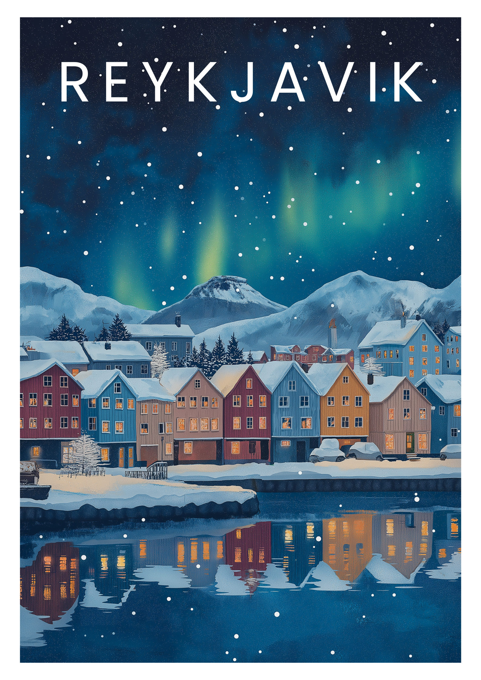 Celebrate the beauty and charm of the Nordic north with this stunning Reykjavik travel poster by Atlas Prints. Inspired by classic mid-century design, it captures Iceland’s unique atmosphere — colourful harbours, mountain horizons, and the serene northern light.